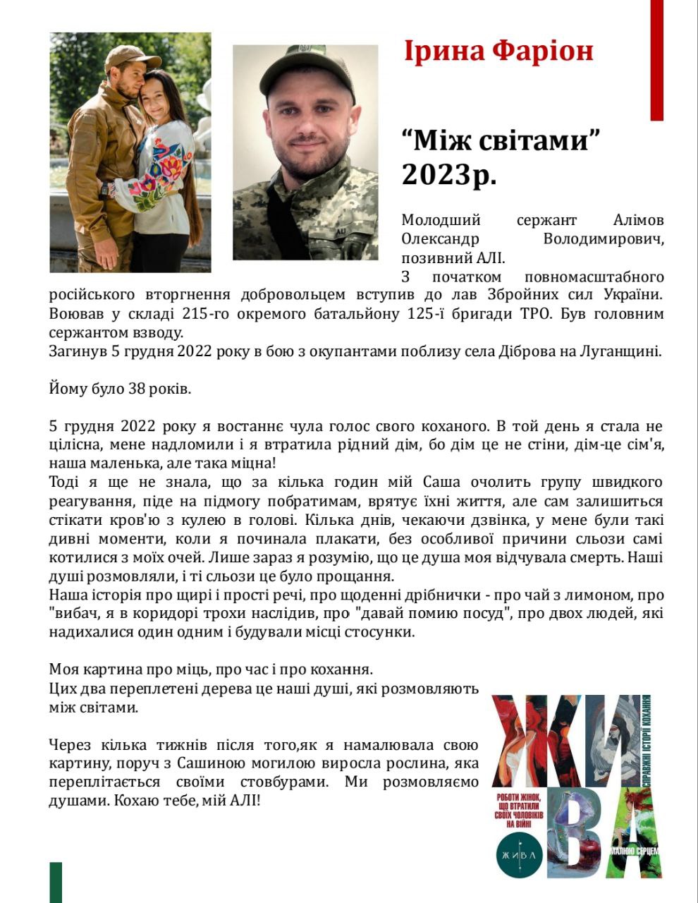 ai5 грудня 2022 року я востаннє чула голос свого коханого. В той день я стала не цілісна, мене надломили і я втратила рідний дім, бо дім це не стіни, дім-це сім'я, наша маленька, але така міцна!
