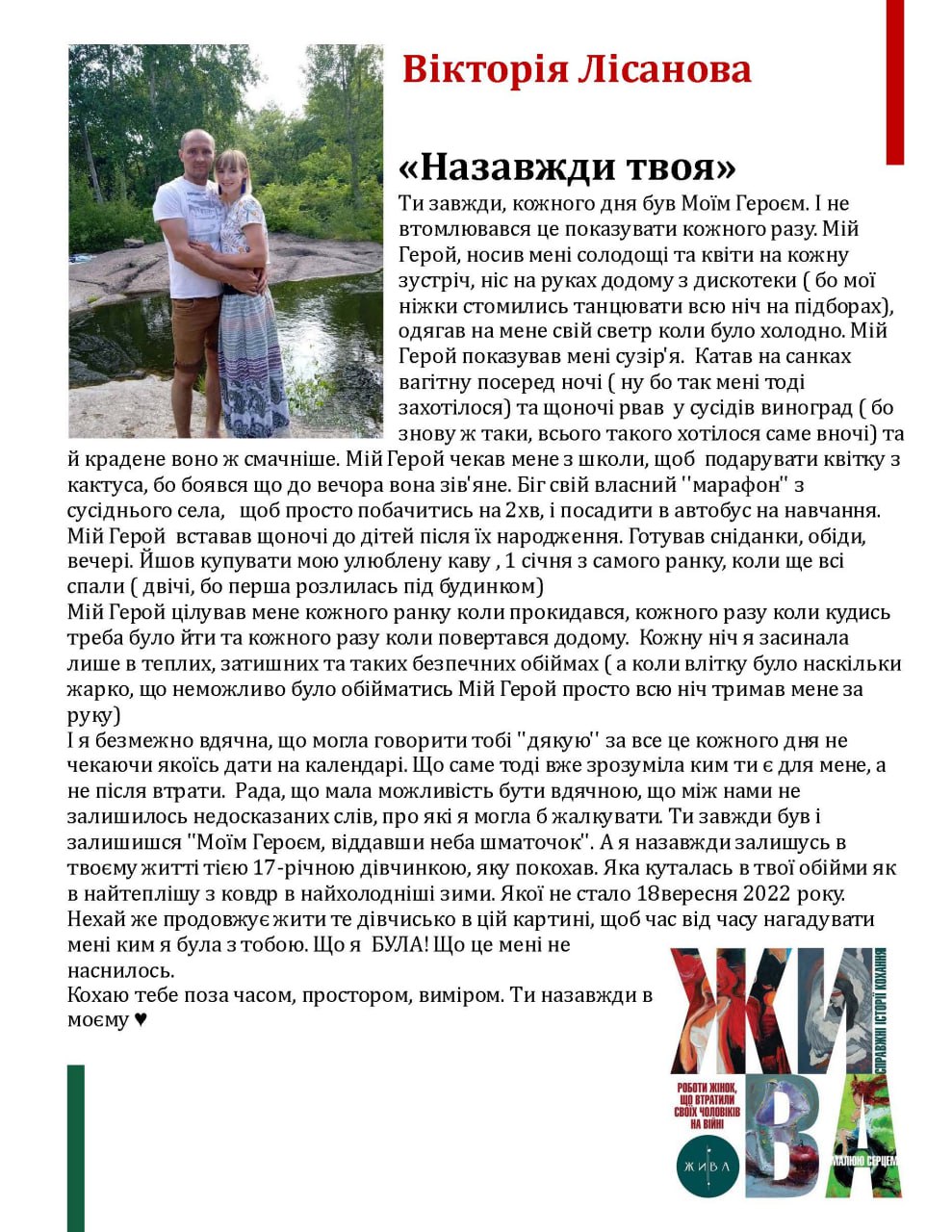 aiА я назавжди залишусь в твоєму житті тією 17-річною дівчинкою, яку покохав. Яка куталась в твої обійми, як в найтеплішу з ковдр в найхолодніші зими. Якої не стало 18 вересня 2022 року. Нехай же продовжує жити те дівчисько в цій картині, щоб час від часу нагадувати мені ким я була з тобою. Що я БУЛА! Що це мені не наснилось.