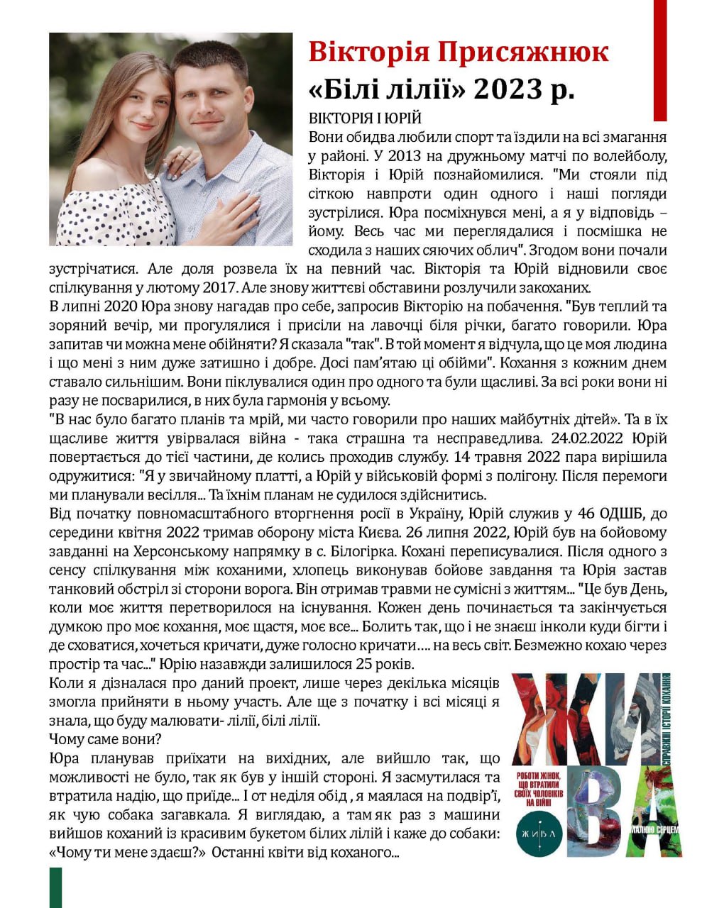 ai"В нас було багато планів та мрій, ми часто говорили про наших майбутніх дітей». Та в їх щасливе життя увірвалася війна - така страшна та несправедлива. 24.02.2022 Юрій повертається до тієї частини, де колись проходив службу. 14 травня 2022 пара вирішила одружитися: "Я у звичайному платті, а Юрій у військовій формі з полігону. Після перемоги ми планували весілля..." Та їхнім планам не судилося здійснитись.